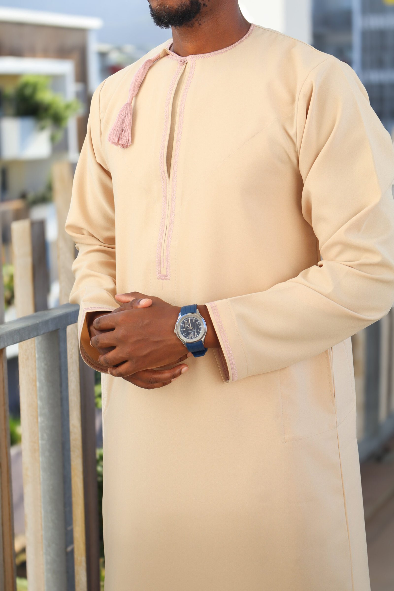 Nos Qamis Omanais sont soigneusement confectionnés à la main à Oman par des artisans qualifiés, utilisant des tissus haut de gamme alliant fibres naturelles et matériaux modernes. Chaque pièce est conçue pour offrir durabilité, confort et élégance, avec une finition impeccable et une broderie raffinée.
